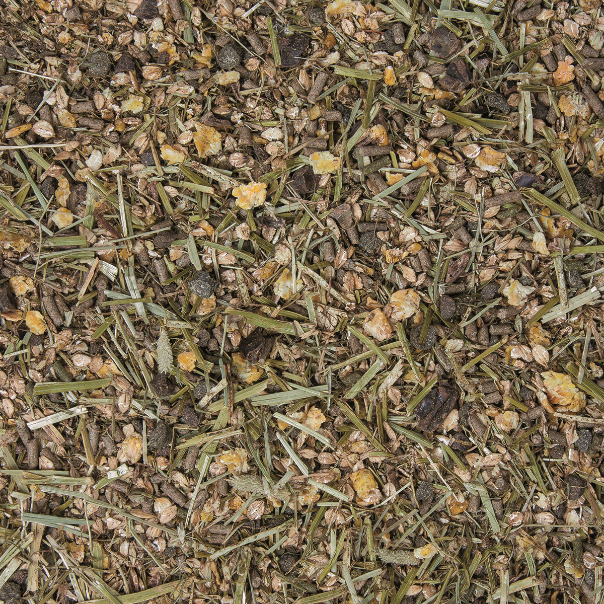Gerstenflocken, Maisflocken, Sonnenblumenschalen, Luzerne, Sonnenblumenextraktionsschrotfutter, Weizenkleie, Johannisbrotschrot, Wiesen-Lieschgras (Timothy), Apfeltrester, Calciumcarbonat, Chicoréepülpe, Bierhefe, Leinöl, Gerste, Natriumchlorid, Monocalciumphosphat, Leinkuchen, Sonnenblumenöl, Magnesiumoxid