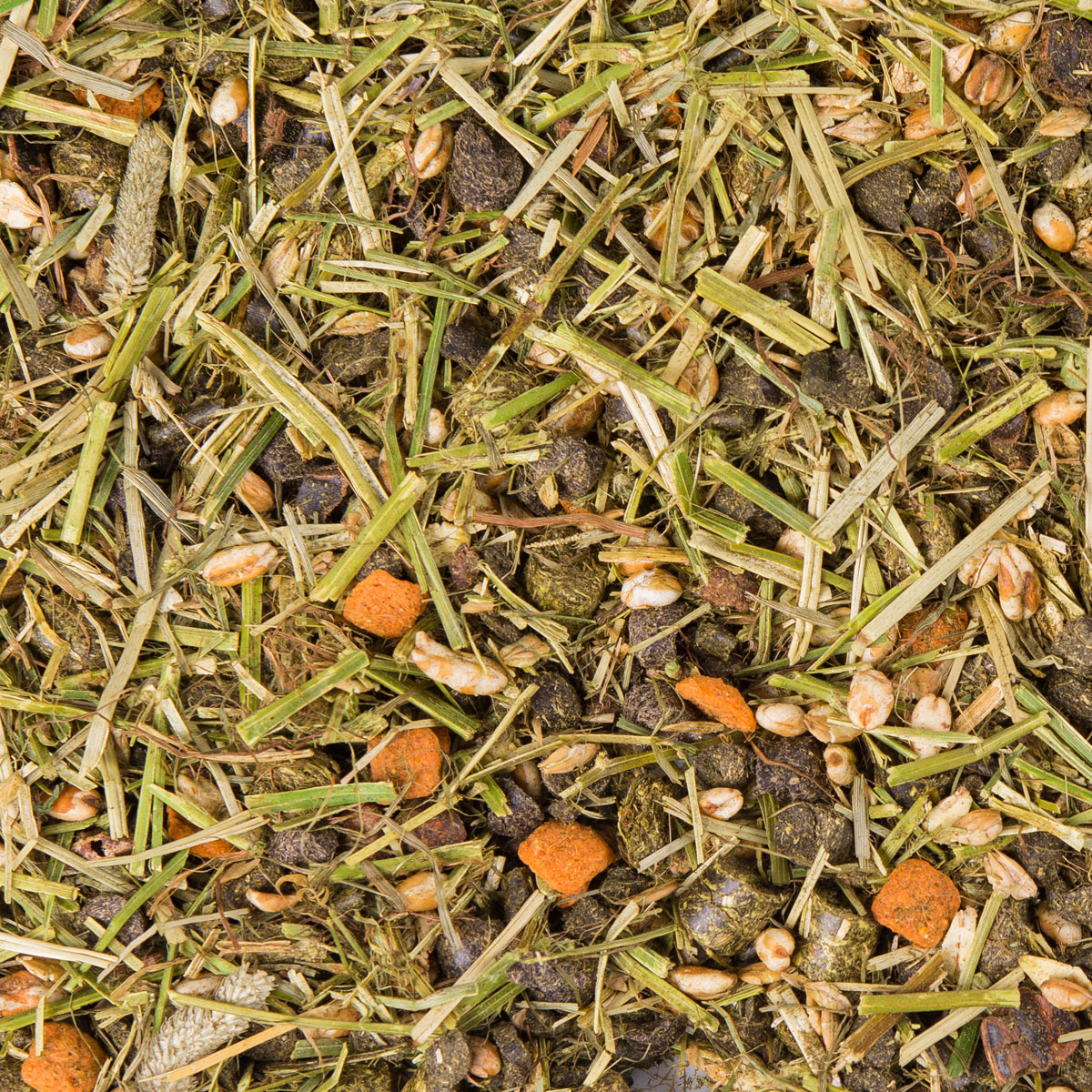 Alfalfa, Sonnenblumenschalen, Gerstenflocken, Wiesen-Lieschgras, Sonnenblumenextraktionsschrotfutter, Apfeltrester, Gerste gepufft, Johannisbrotschrot, Mais extrudiert, Sonnenblumenöl, Leinkuchen, Calciumcarbonat, Monocalciumphosphat, Natriumchlorid, Maiskeime, Magnesiumoxid, Rote Beete, Leinöl, Kräuter (Kurkuma, Basilikum, Rosmarinblätter, Fenchelsaat, Minze, Brennnesselblätter)